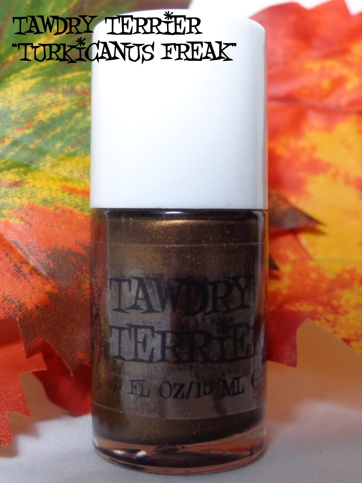 This is our new Thanksgiving polish, Tawdry Terrier "Turkicanus Freak." Turkicanus Freak is a raw umber glass fleck polish with red and copper shimmer inspired by a Thanksgiving Feast. This is 2 coats of Turkicanus Freak.